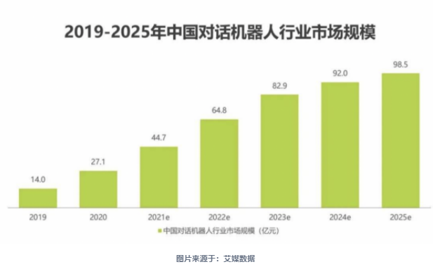 近日,艾瑞咨询发布了《2021年中国对话机器人chatbot行业发展研究报告》,该报告指出对话机器人赛道从2015年开始快速升温,在2018年融资事件数量达到峰值,而后进入平稳发展阶段。2020年对话机器人行业市场规模为27.1亿元,预计在2025年将达到98.5亿元。