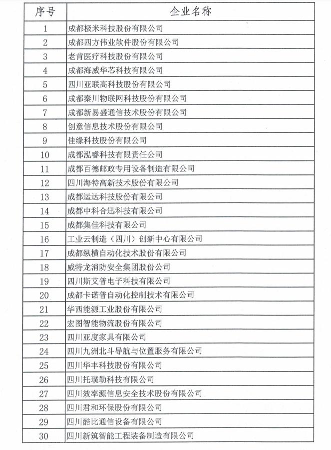 30户企业名单中,新技术企业9家,新产业企业8家,新业态企业7家,新模式企业6家;分地区看,成都市20户,绵阳市2户,自贡市1户,泸州市1户,德阳市1户,遂宁市1户,内江市1户,乐山市1户,宜宾市1户,眉山市1户。总体看,企业在各自发展领域具有代表性和示范性,新经济特征显著。